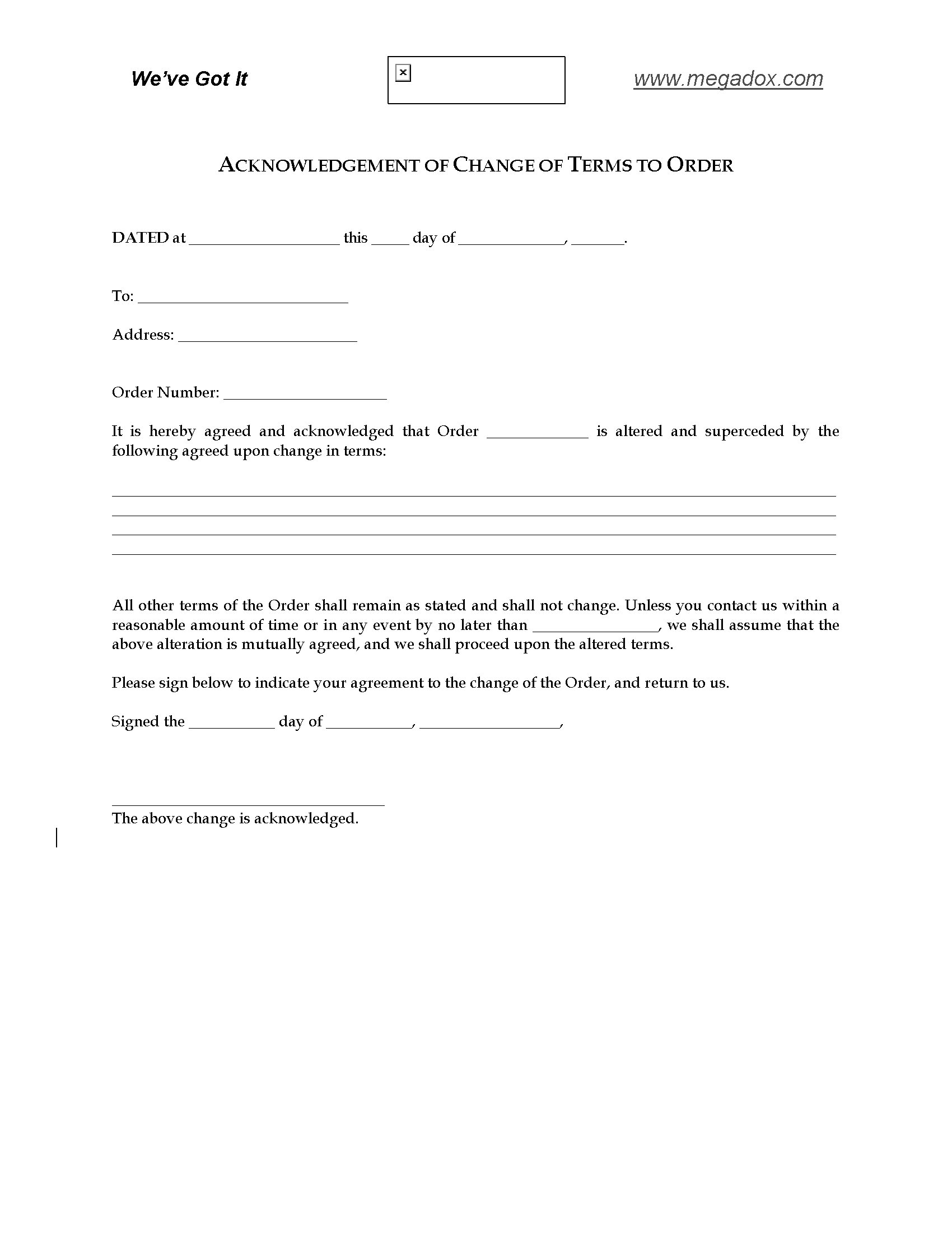 ACKNOWLEDGEMENT OF CHANGE OF TERMS TO ORDER