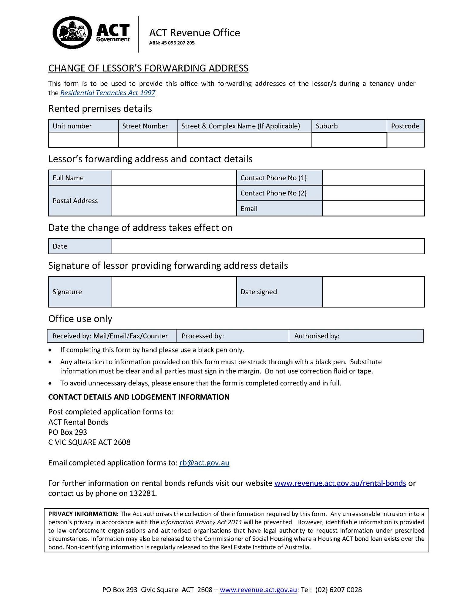 Lodge a residential rental bond with the ACT Revenue Office with this free form pursuant to the Residential Tenancies Act 1997.