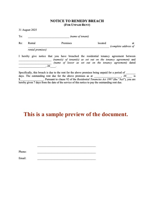This template legal agreement includes all necessary clauses required by relevant legislation. Specifically, it incorporates provisions for units governed by the Unit Titles Act 2001, ensuring that the unique requirements for such properties are addressed.
