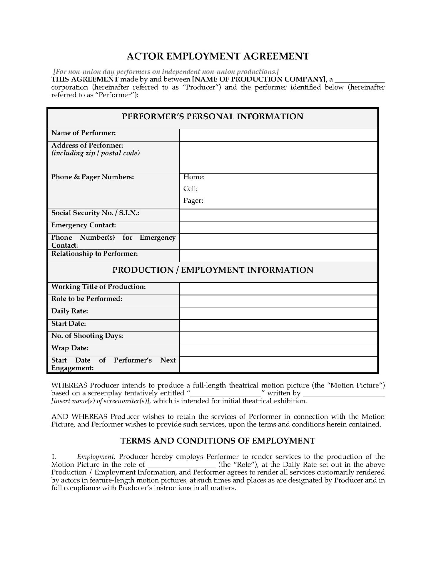 - The contract contains provisions for both SAG and non-union performers. Just choose the appropriate clauses for your project.