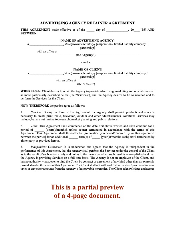 This Agency of Record Retainer Contract is available as a customizable and reusable legal template in MS Word format. Pay once, use as often as you need.