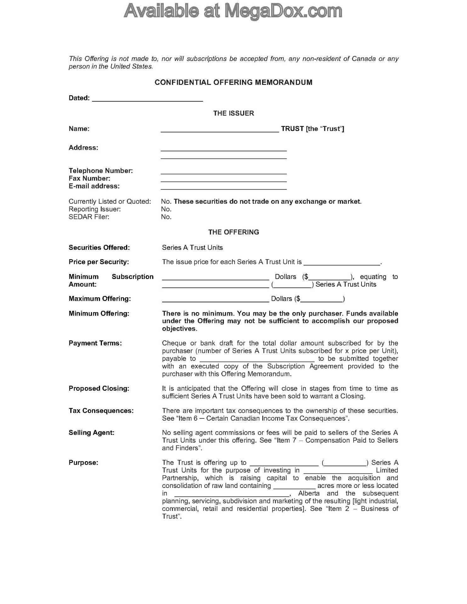 - This trust is set up in the Province of Alberta to be utilized as a real estate investment trust (REIT) to raise capital for a real estate development through a private placement of mutual fund trust units.