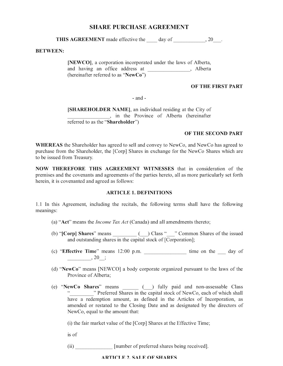 Prepare a section 85 Share Purchase Agreement (value stated) with this rollover document package for the Province of Alberta.