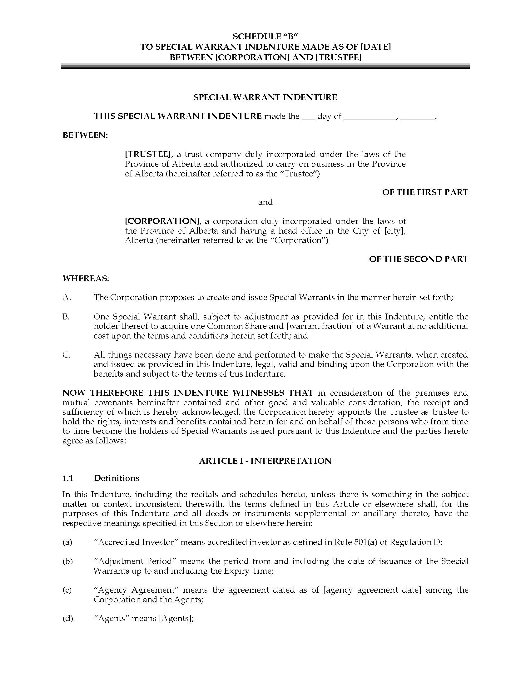 Warrant Indenture for Flow Through Shares | Canada