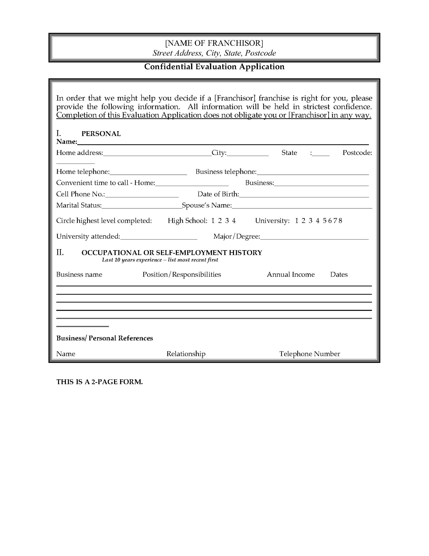 Franchisors, use this 4-page Franchisee Profile Questionnaire to gather information from applicants to help you recruit suitable franchisees for your system.
