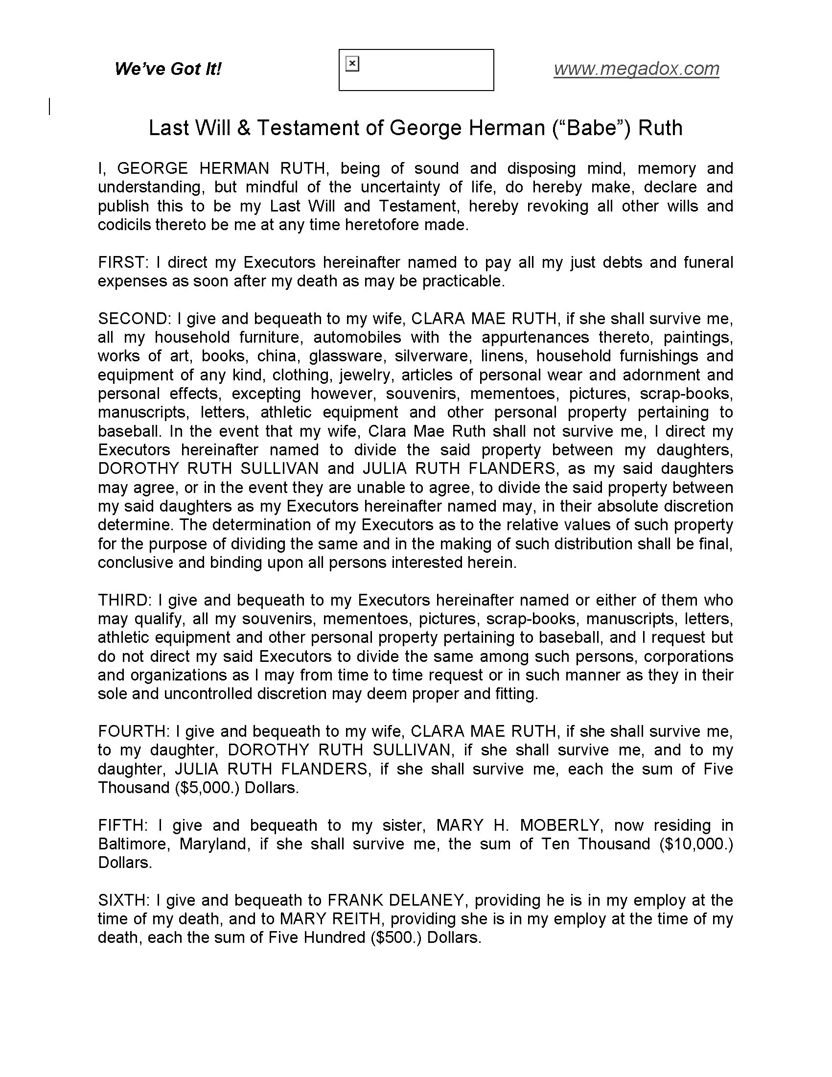 Download this free copy of the Last Will and Testament of baseball great Joe Dimaggio (1914-1999).