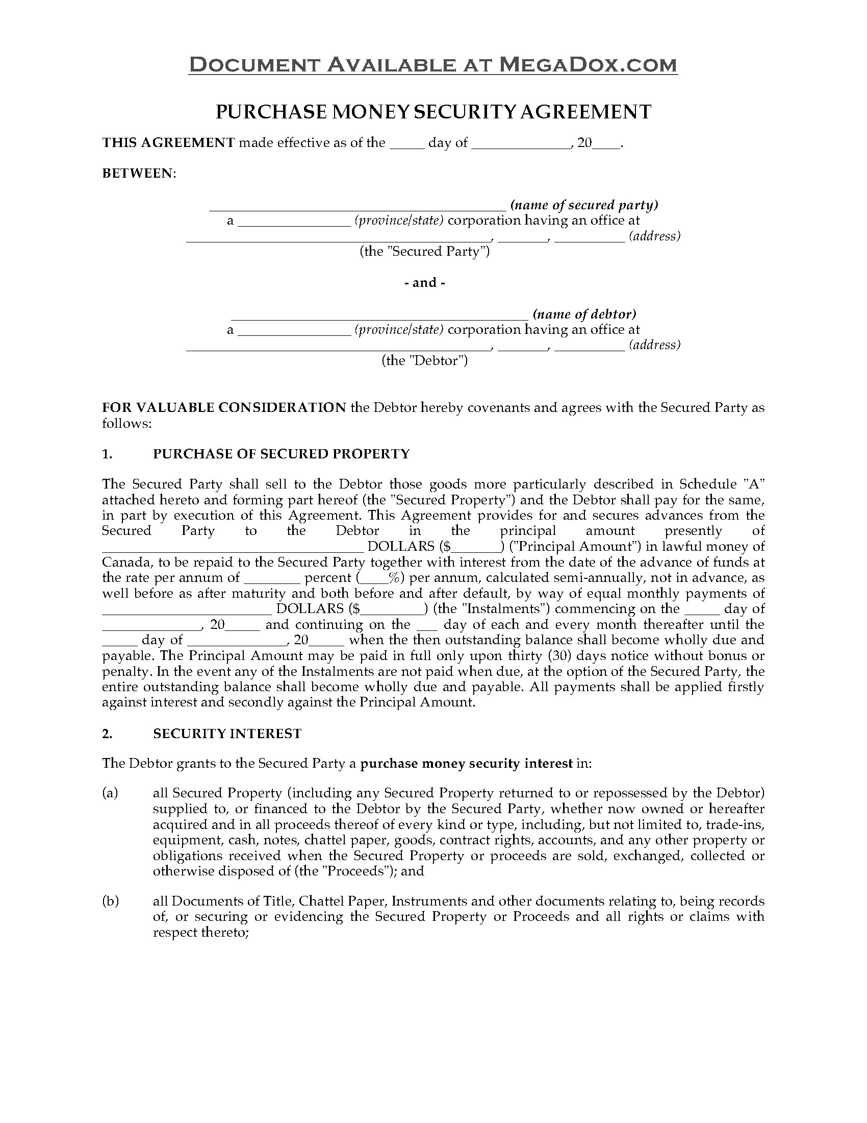 - The Purchase Money Inventory Security Agreement gives Canadian suppliers a more secure method of selling goods on credit. It can be used in any province that has Personal Property Security Act legislation.