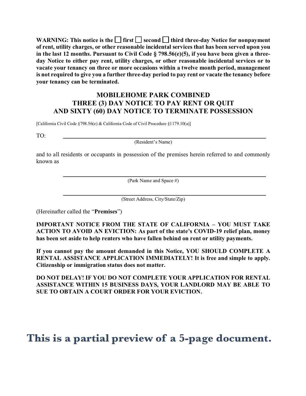 - The California 60-day Notice to Terminate Tenancy of Mobile Home form is available in MS Word format.