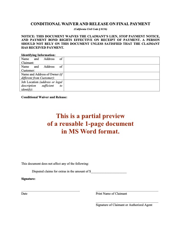 - California Conditional Waiver and Release of Lien (Final Payment), and