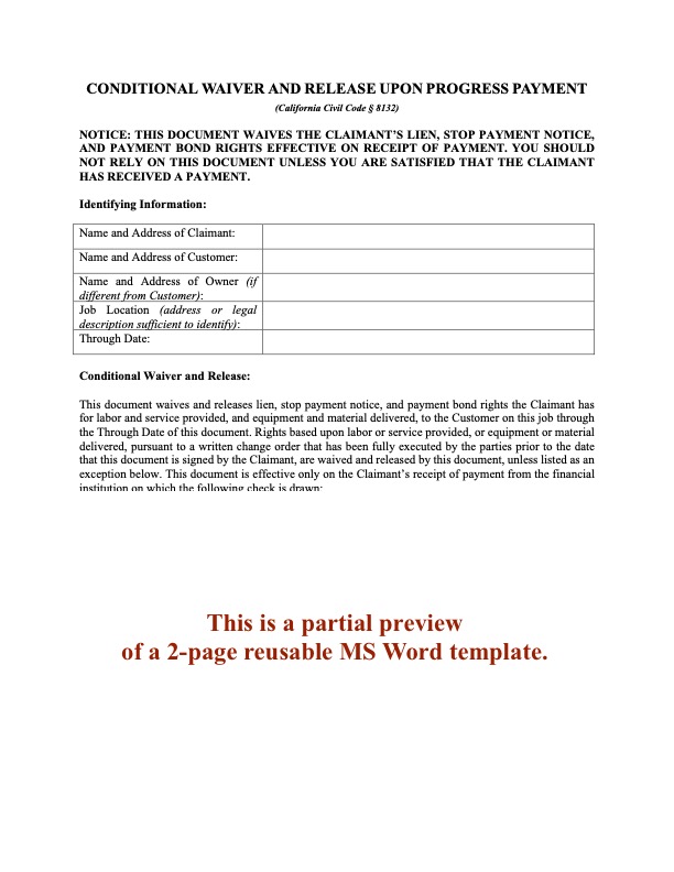 - This Conditional Waiver and Release of Lien form is a digital download in MS Word format that you can use over and over again.
