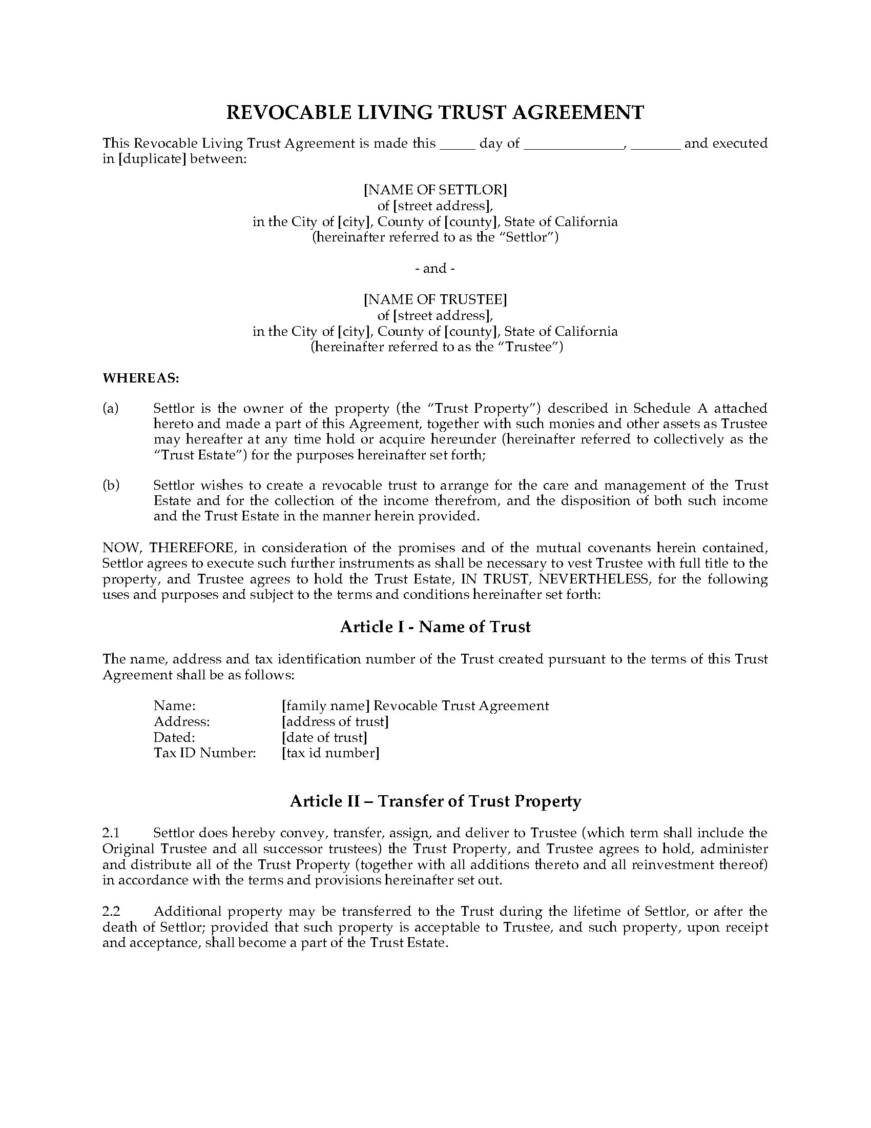 Protect your assets and avoid probate proceedings by placing your estate property into trust with this Revocable Living Trust Agreement for California residents.
