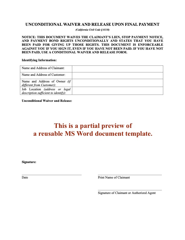 Use this template form to issue a conditional waiver and release of lien for receipt of final payment on a construction project in California.