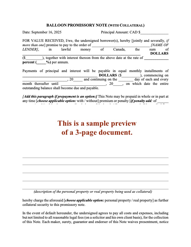 Secure the balance payable to the vendor under an asset purchase or rollover agreement with this Promissory Note form for Canadian businesses.