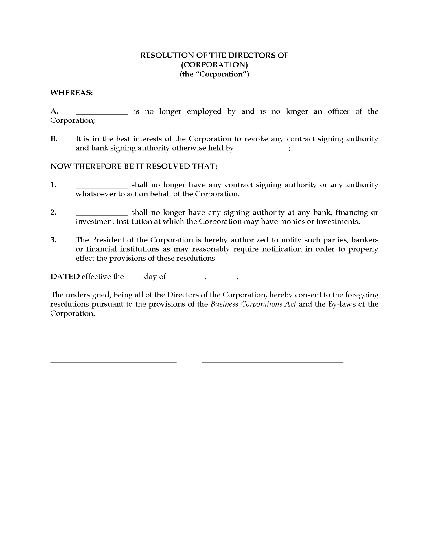 - The documents can be used by corporations formed under any Business Corporations Act, whether federally or provincially. Different forms may be required for Quebec.