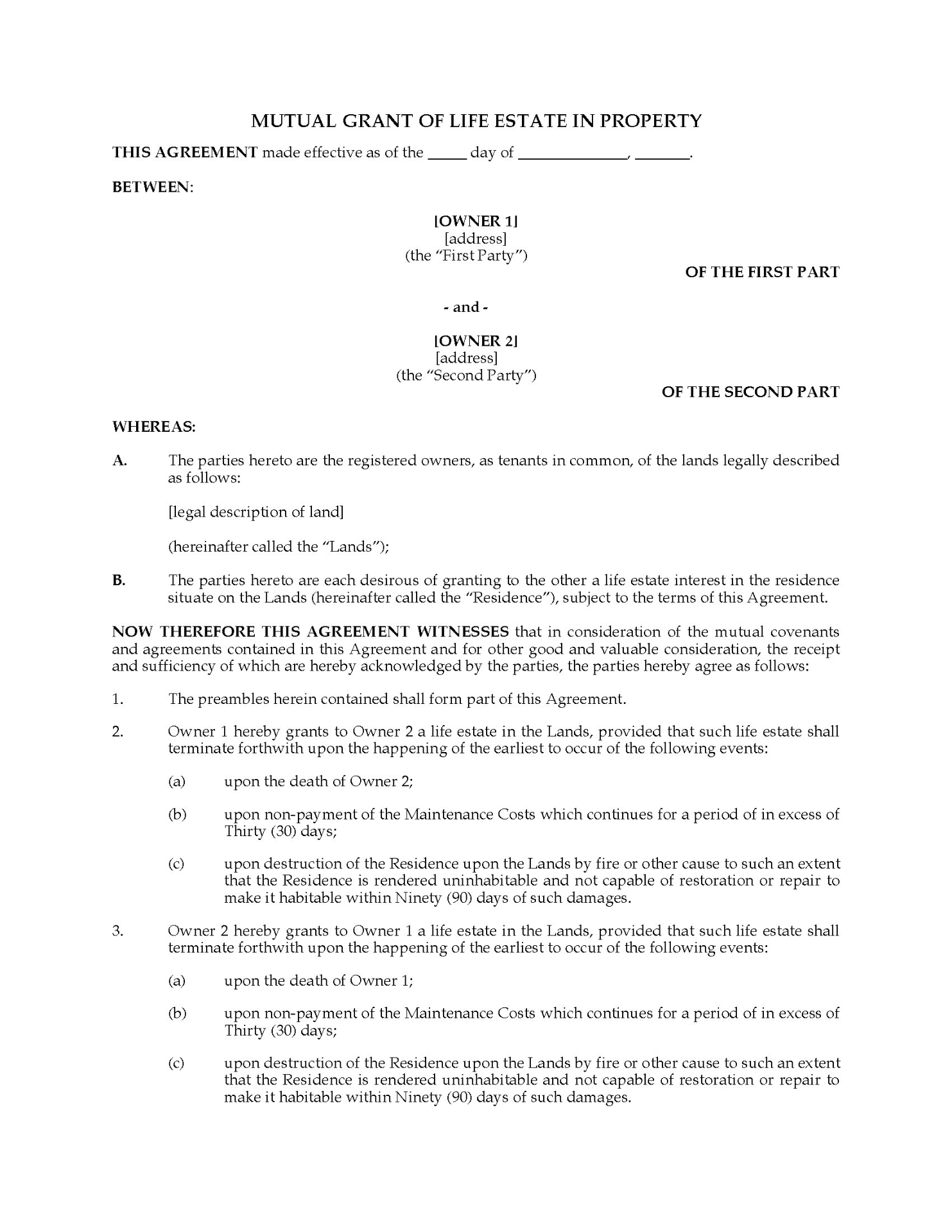 Grant a life estate in a residence to your spouse with this free Will Clause. The clause is generic and can be used in wills in many different countries.
