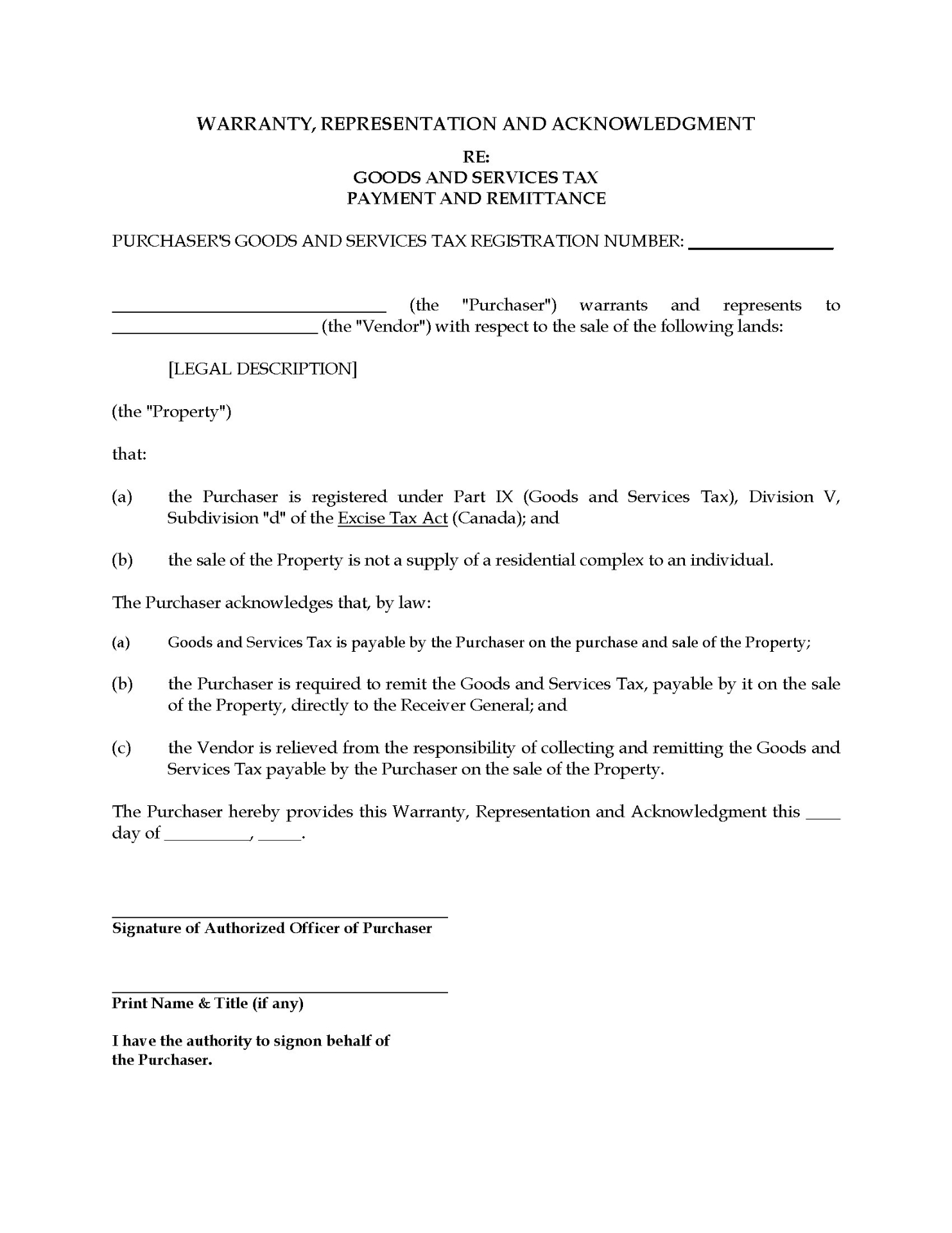Purchaser's GST Warranty and Indemnity | Canada