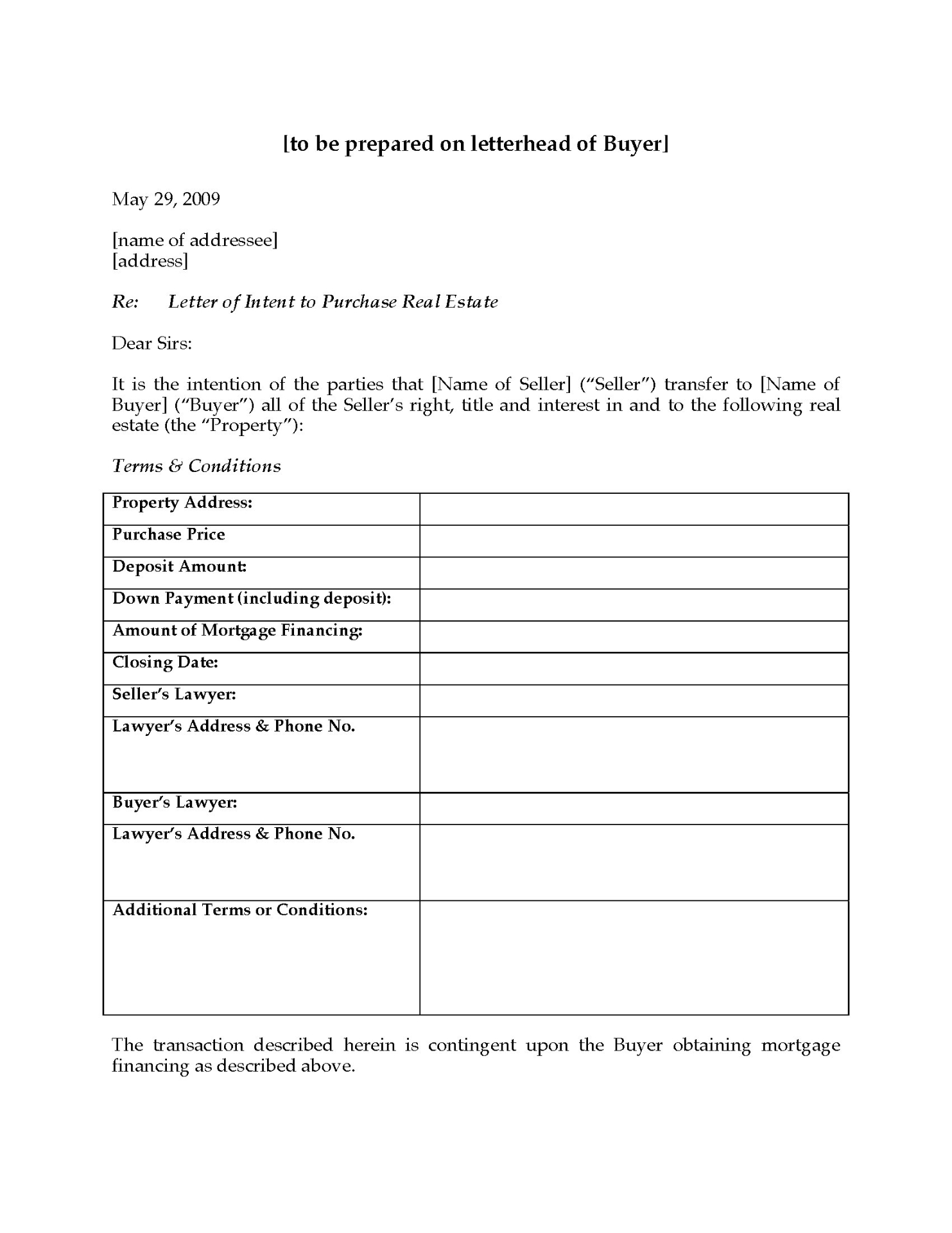This LOI template can be used for commercial real estate transactions in any Canadian province or territory (with the possible exception of Quebec). It is available in MS Word format and is intended strictly for properties located within Canada.
