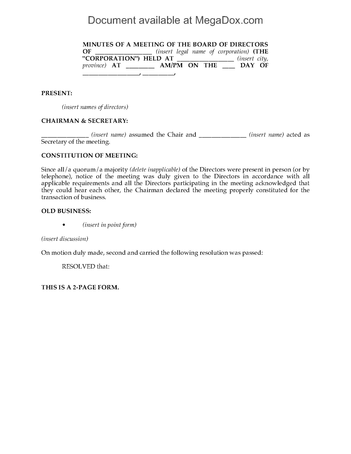 - With this form, it's easy to fill in the blanks where indicated and prepare the final version of the minutes for distribution to the shareholders.
