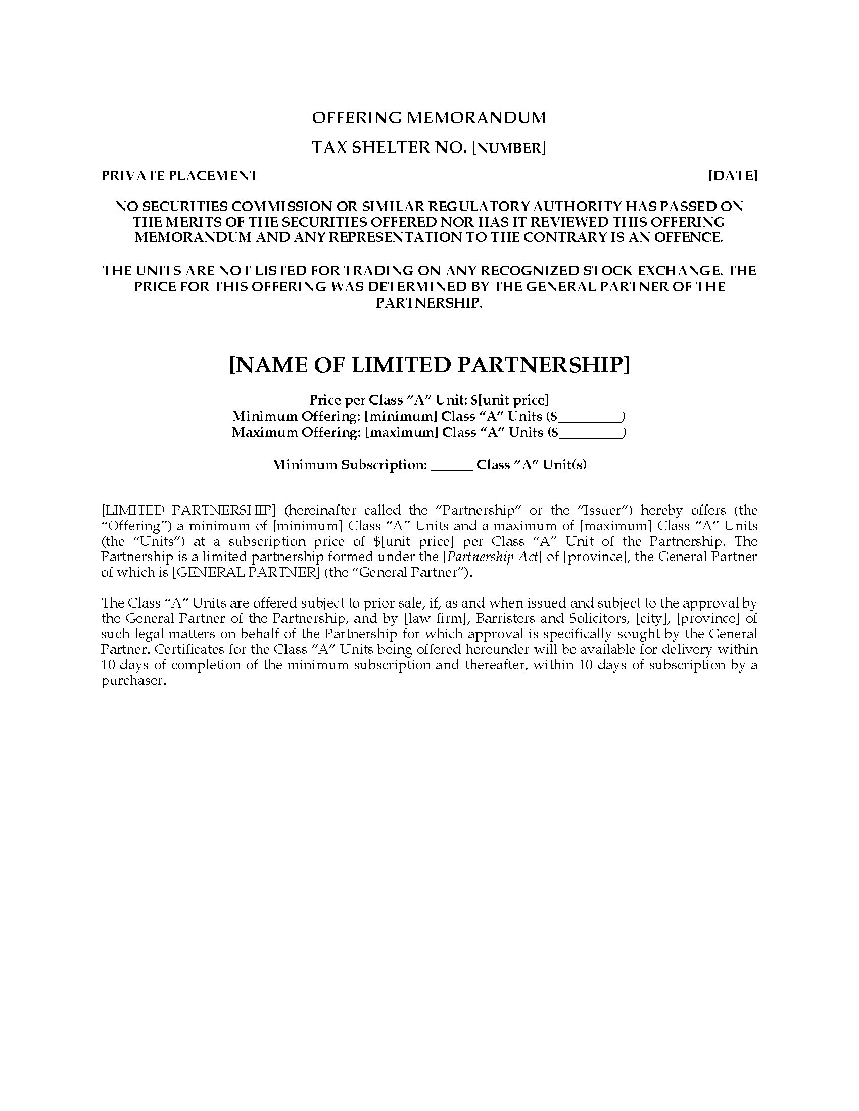 Subscription for Limited Partnership Units | Canada