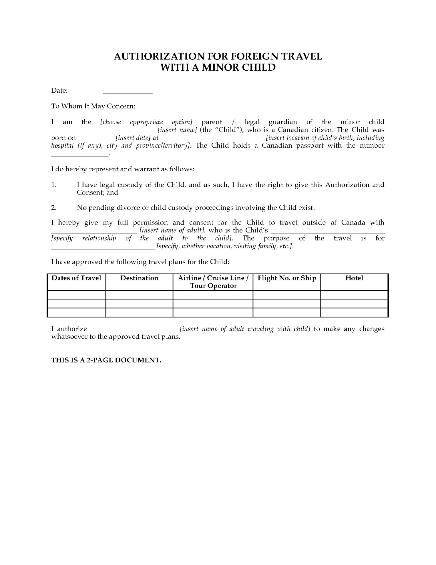 Give written consent for your child to travel within Canada in the company of another adult with this Parental Consent and Authorization form.
