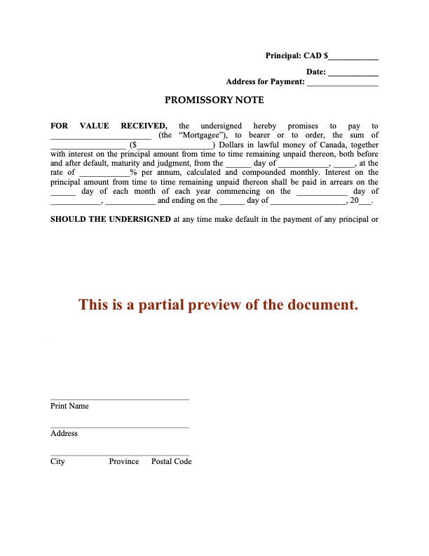 Promissory Note with Monthly Payments, No Penalty | Canada