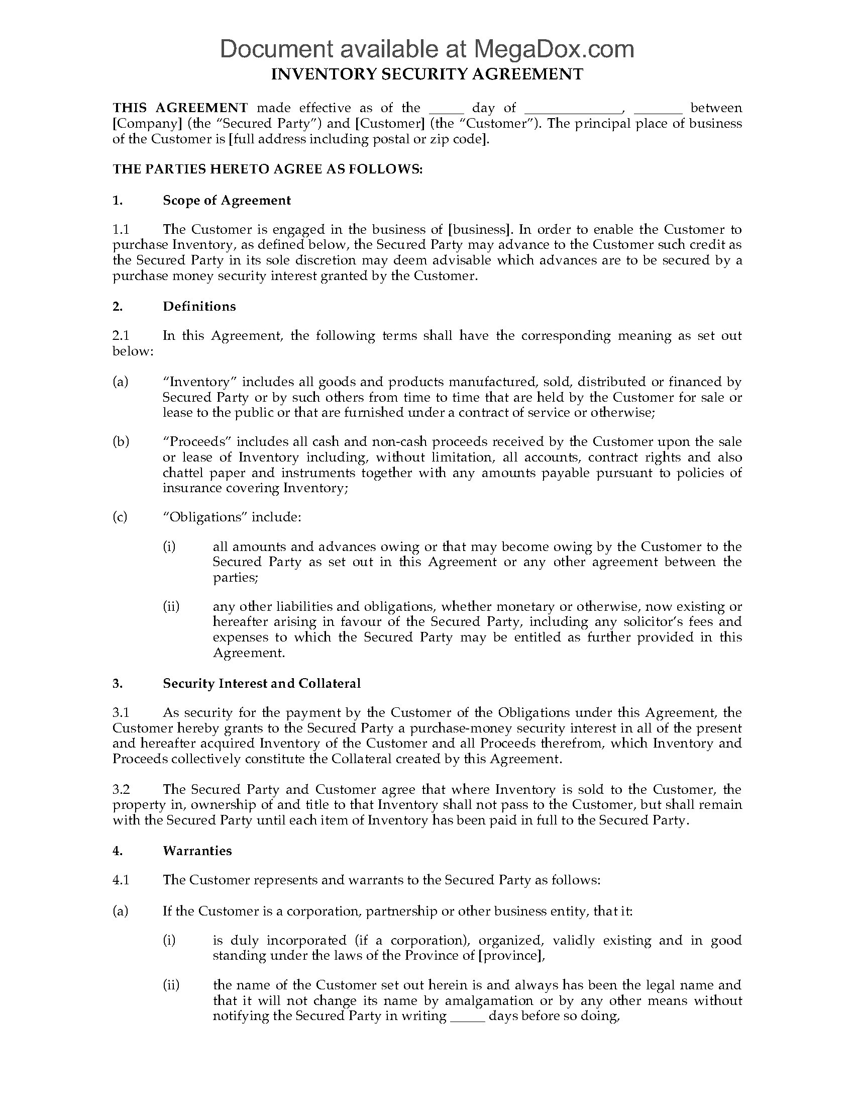 - This legal contract is prepared in accordance with the Personal Property Security Act.