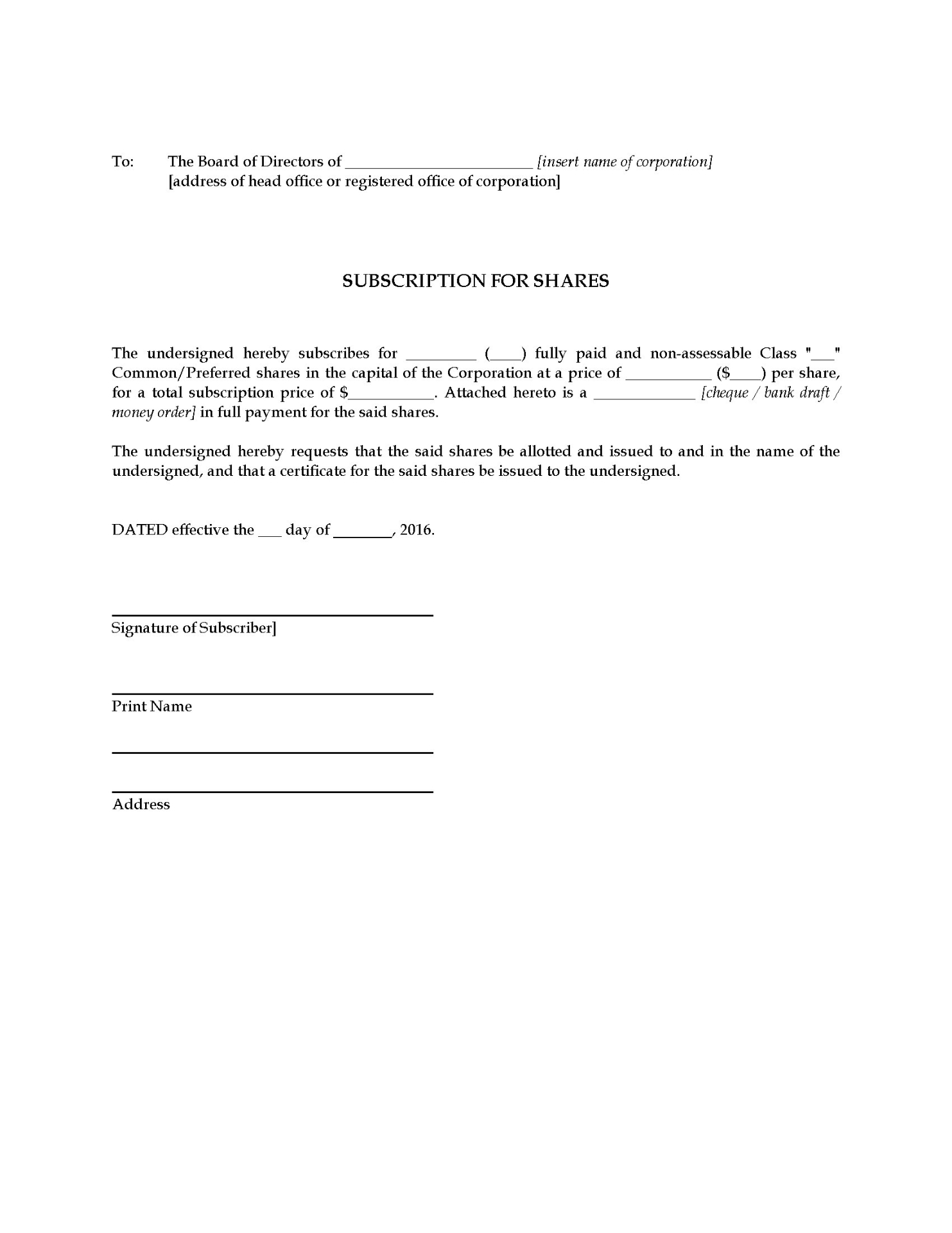 Directors Resolution to Issue New Shares | Canada