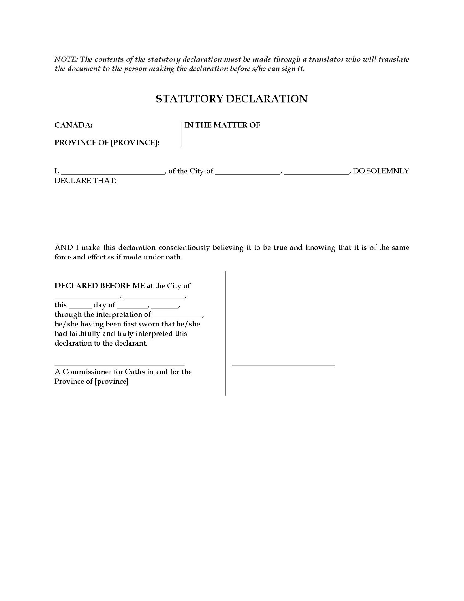 - This free Statutory Declaration for Blind Declarant form can be used in any province or territory of Canada.