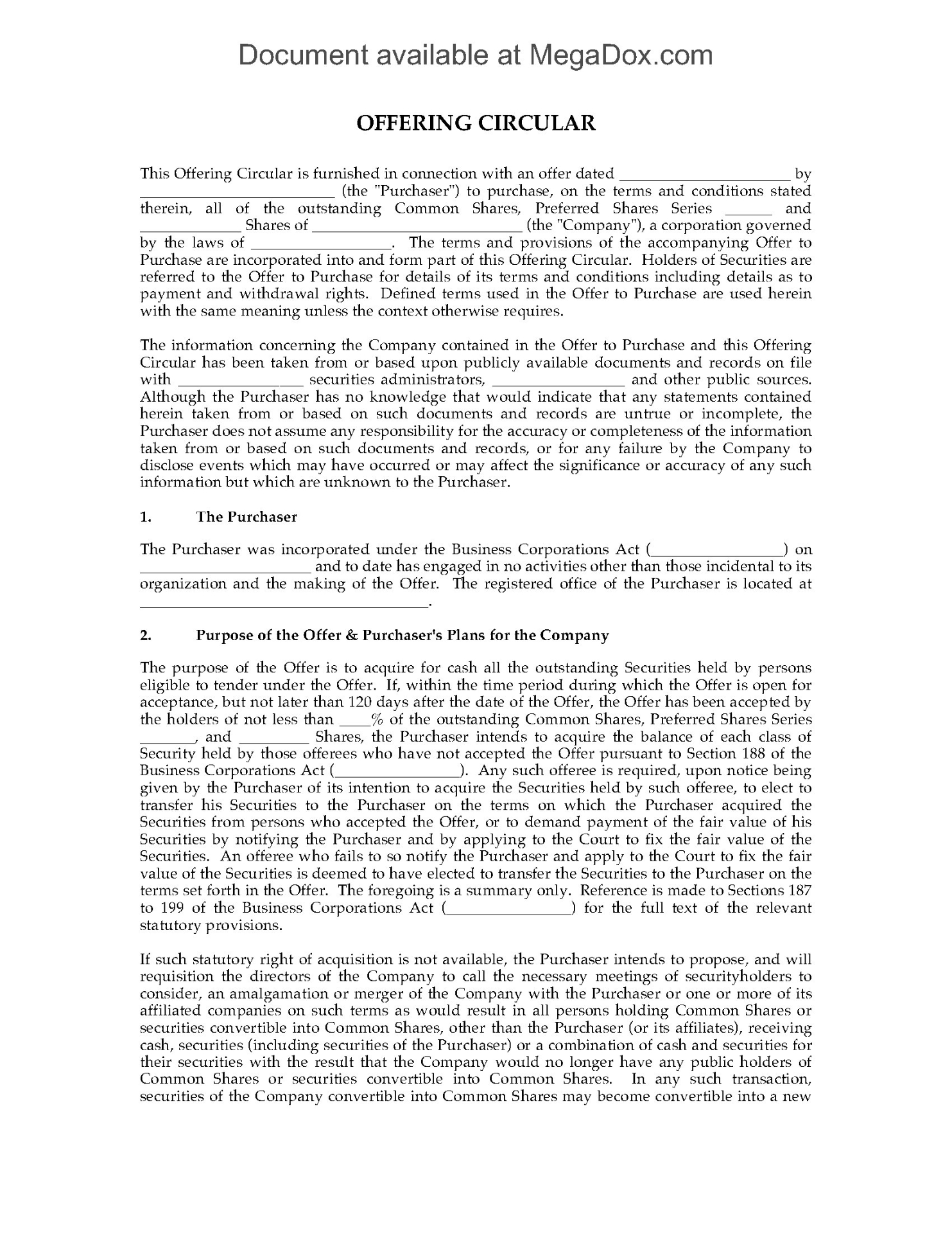 - Management Information Circular, detailing the current status of the corporation, and setting out the details of the proposal and recommending that the shareholders accept the offer;
