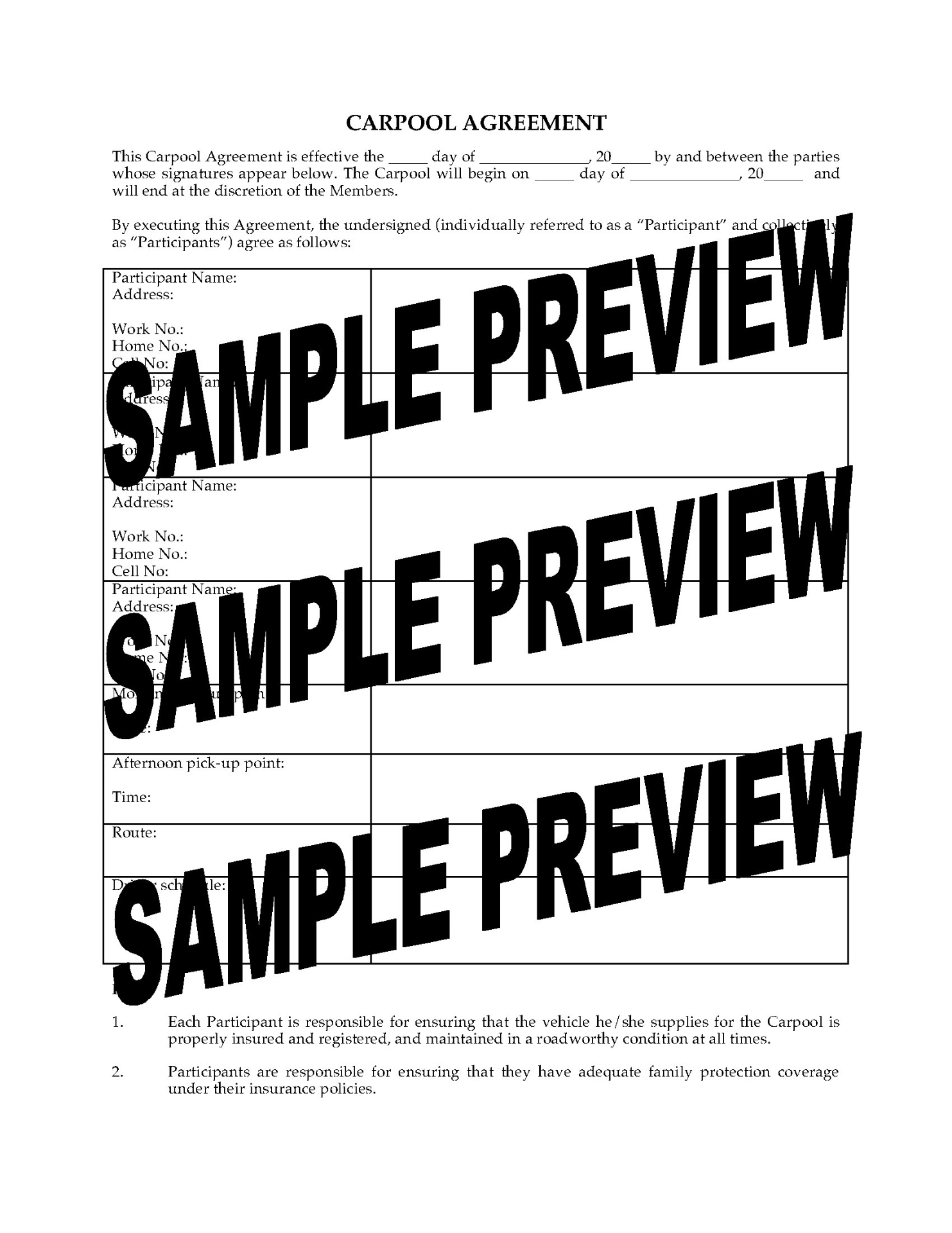 - Intent. The Agreement is not a legally binding contract. But it does express the intent of the carpool members, and it places the responsibility for the safety of the vehicle and passengers on the driver.