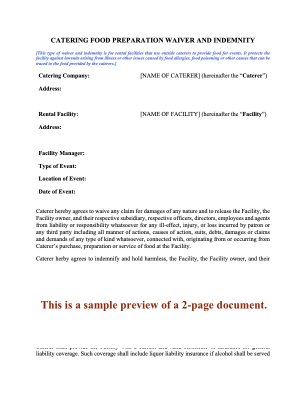 This Catering Waiver and Indemnification Agreement template is provided in MS Word format and is fully editable to fit your specific circumstances.