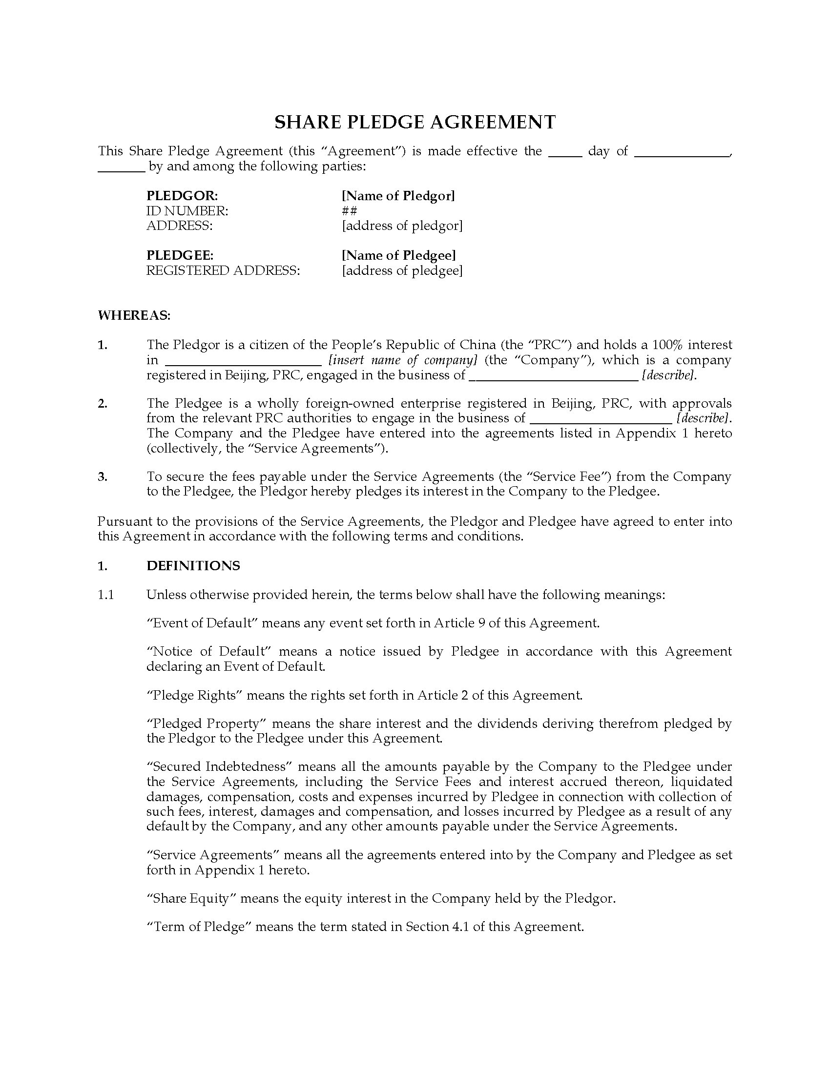 Pledge shares in a Chinese company as security for a debt obligation with this template Share Pledge Agreement for China.