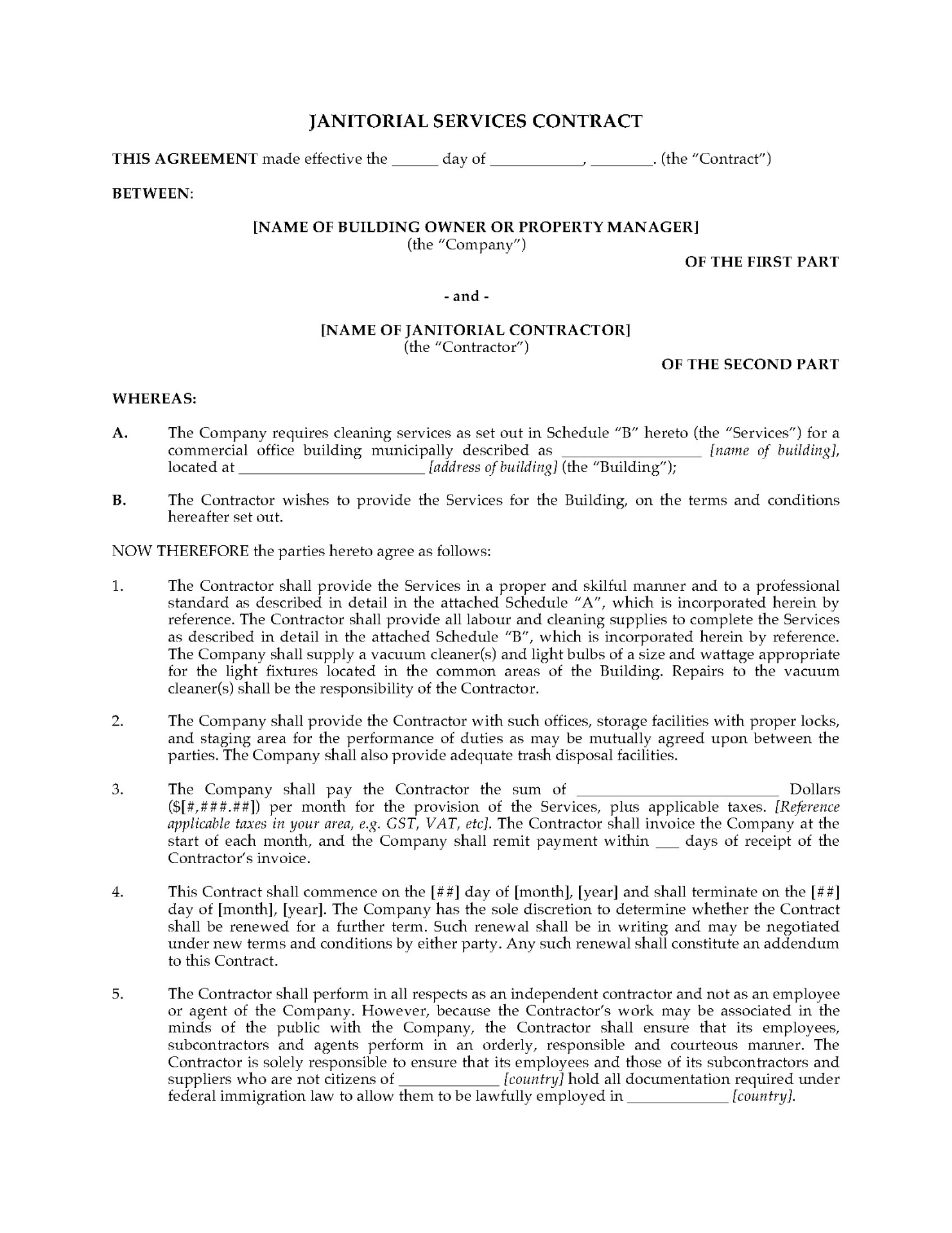 - The agreement is between the condo corporation and an independent contractor who will provide janitorial services for the common areas of the condominium.
