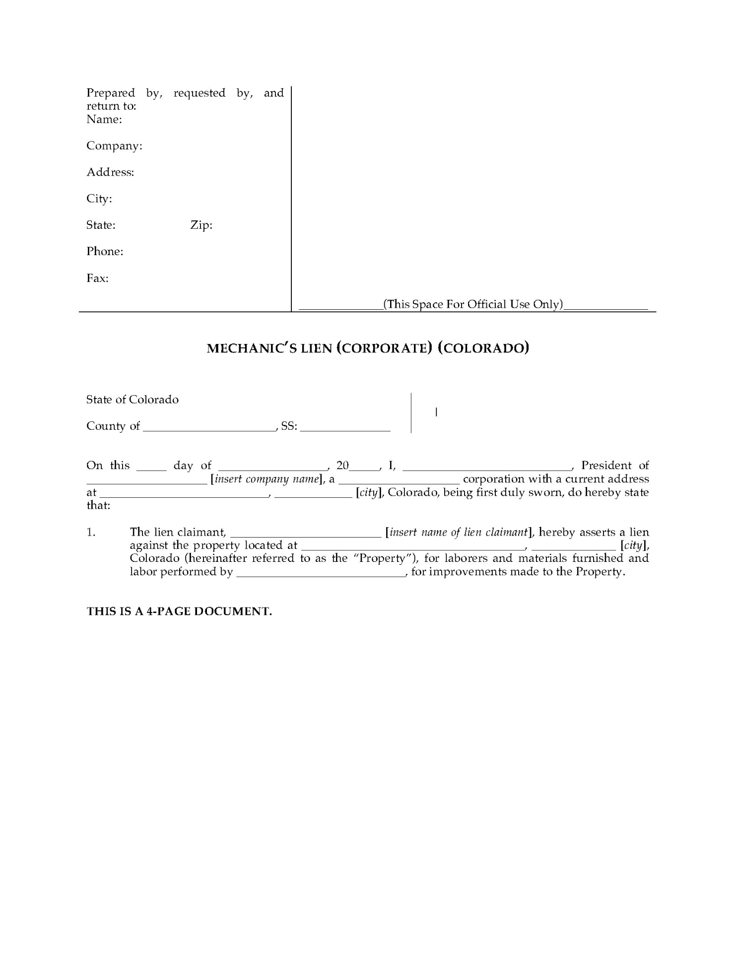 - This form is for a lien claim being made by a corporation. If the claimant is a person, use the Notice of Intent to File Lien - Individual form.