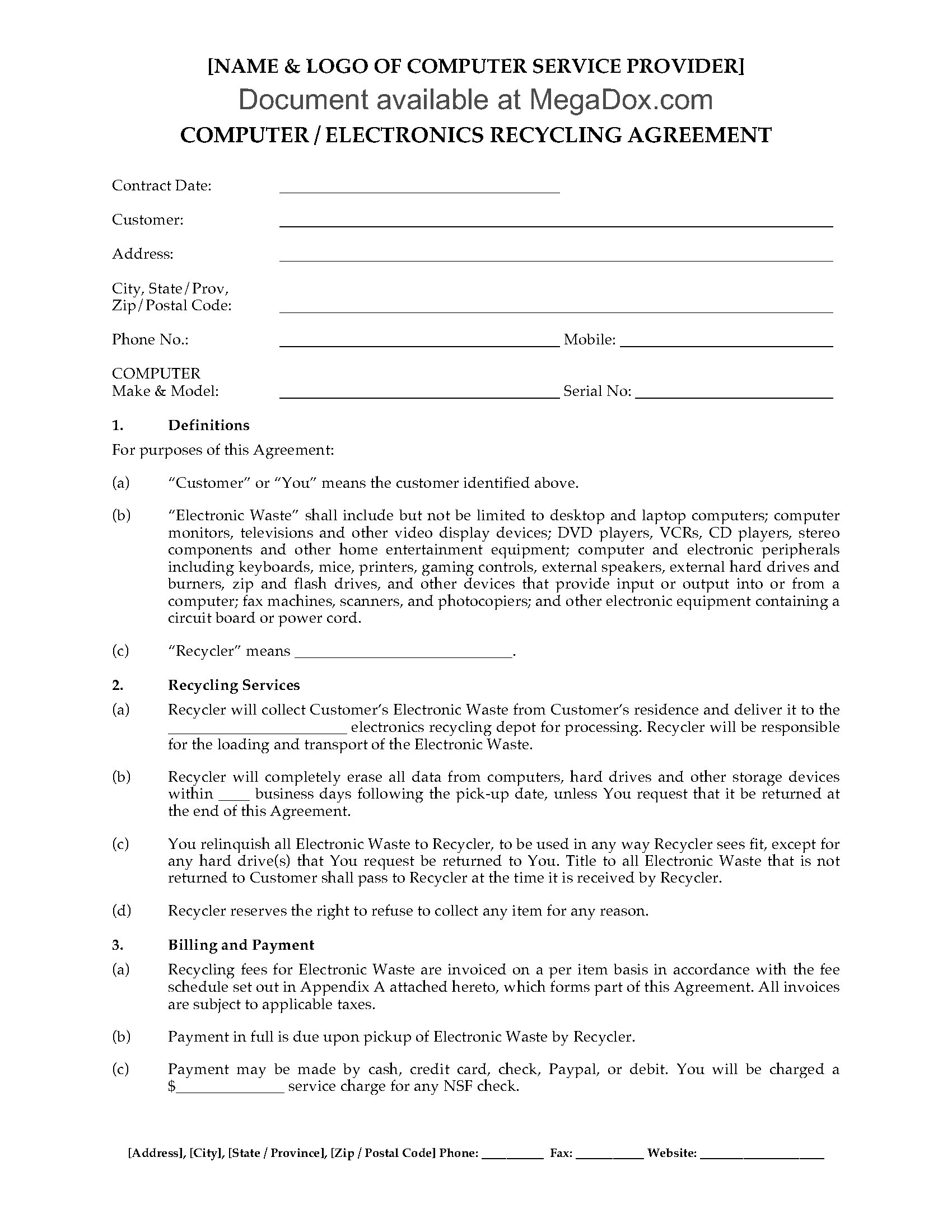 If you're in the computer and electronics recycling business, you could be open to damage claims from customers over lost or improperly destroyed data. You need this Recycling Agreement with indemnity provisions.