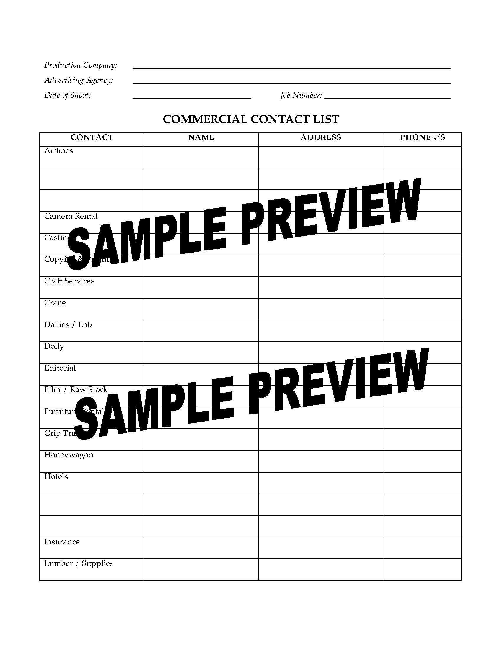 This template Contact List form is a great way to track contact names and phone numbers for all crew, suppliers and services involved in filming a television commercial, including: