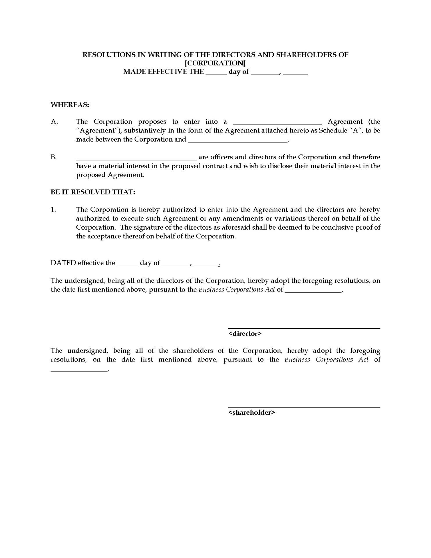 - Insiders such as directors and shareholders are required by law to make full disclosure of any material interest they have under every contract, agreement or other arrangement being contemplated by the corporation.