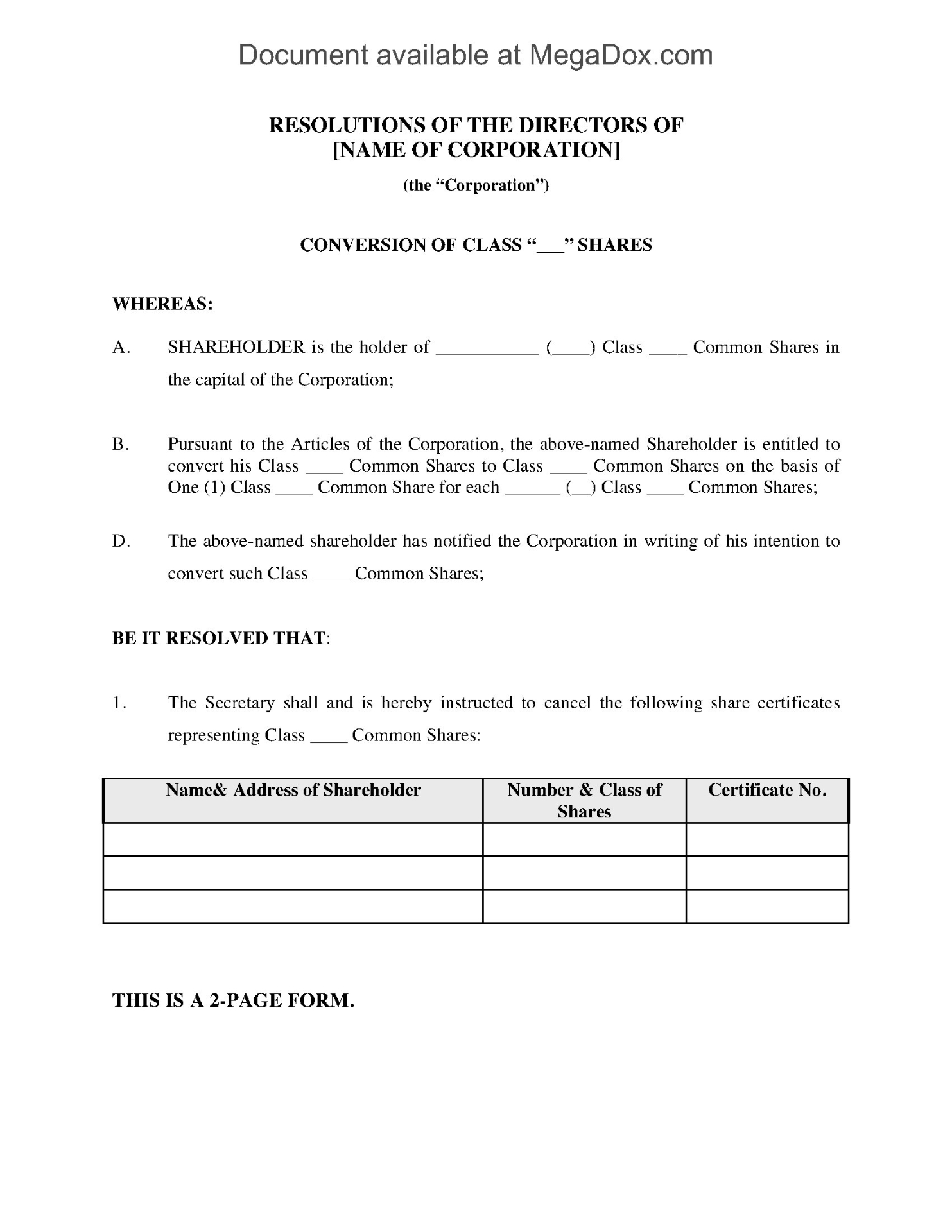 - The template also includes Directors and Shareholders Resolutions which are required to authorize the share exchanges.