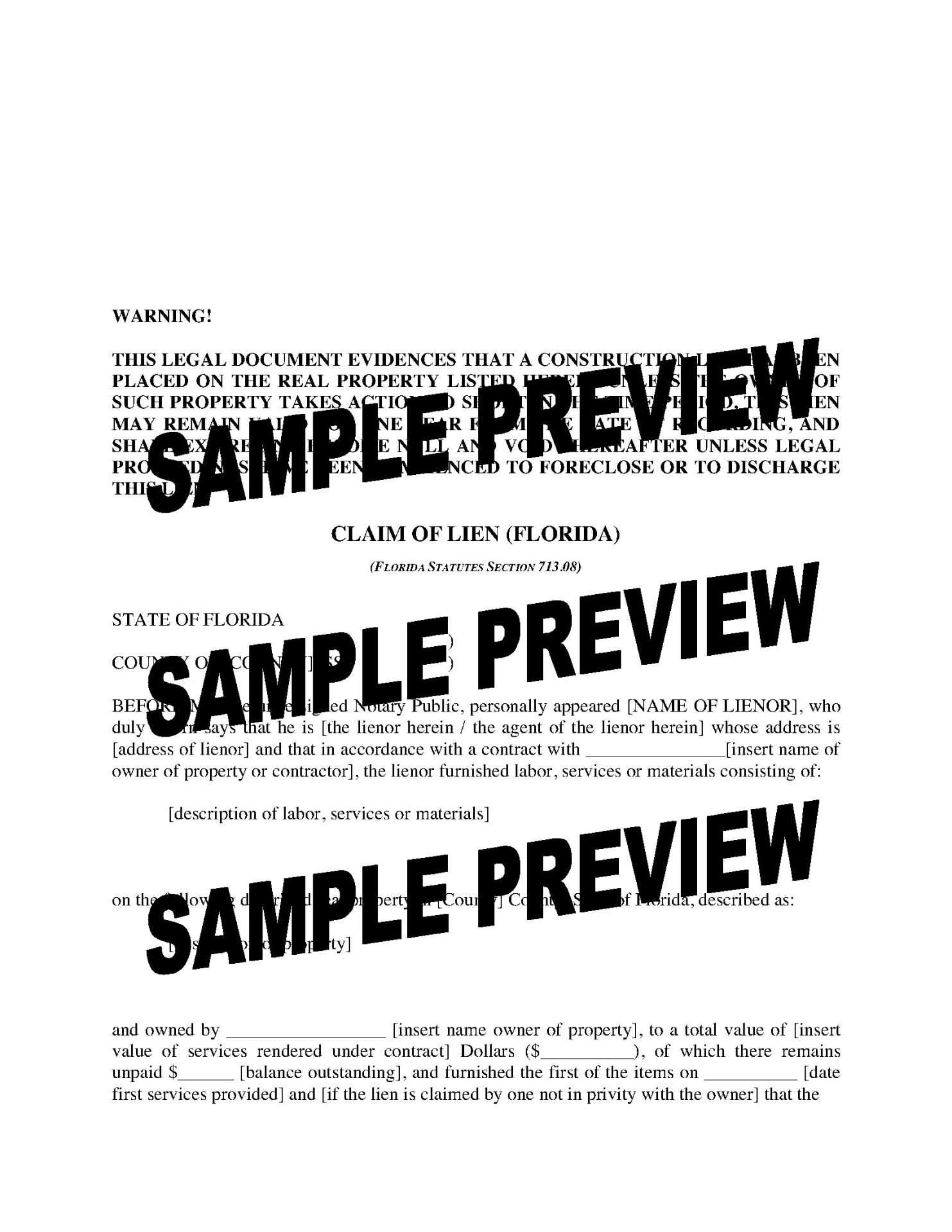 This document is exclusively intended for use within the State of Florida. Due to variations in lien laws from state to state, this form should not be used for projects located outside of Florida.