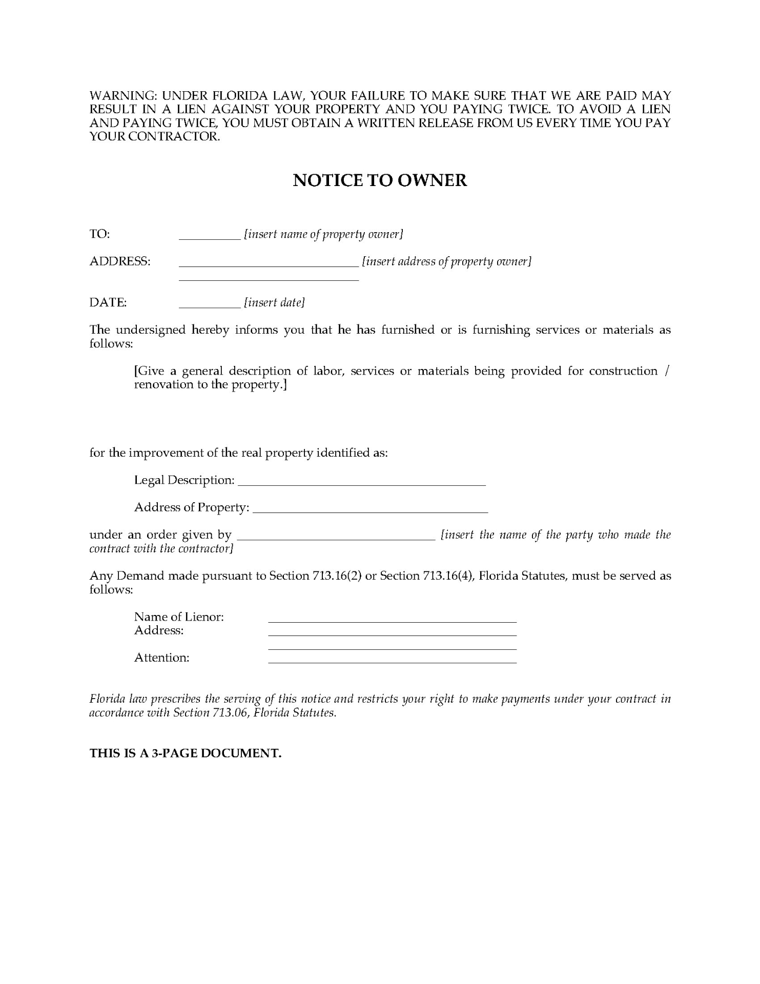 This document is intended solely for use within the State of Florida. Because lien laws vary between states, it should not be used for projects located outside of Florida.