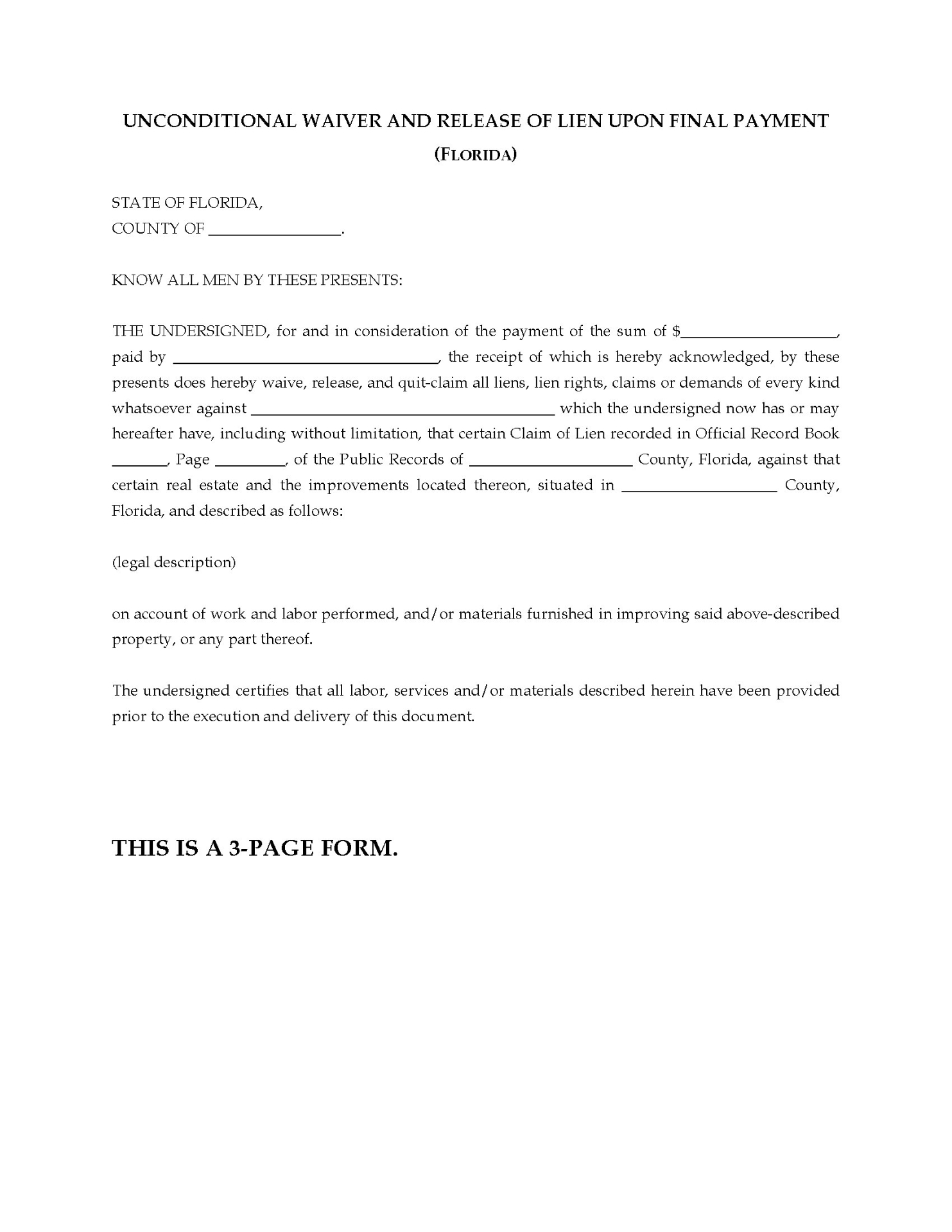 - This Claim of Lien form is intended for use only in the State of Florida.
