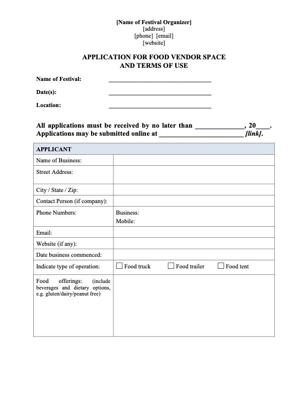 Prepare an application for a food truck vendor to operate at a regularly scheduled market with this Application Form and Terms of Use template.