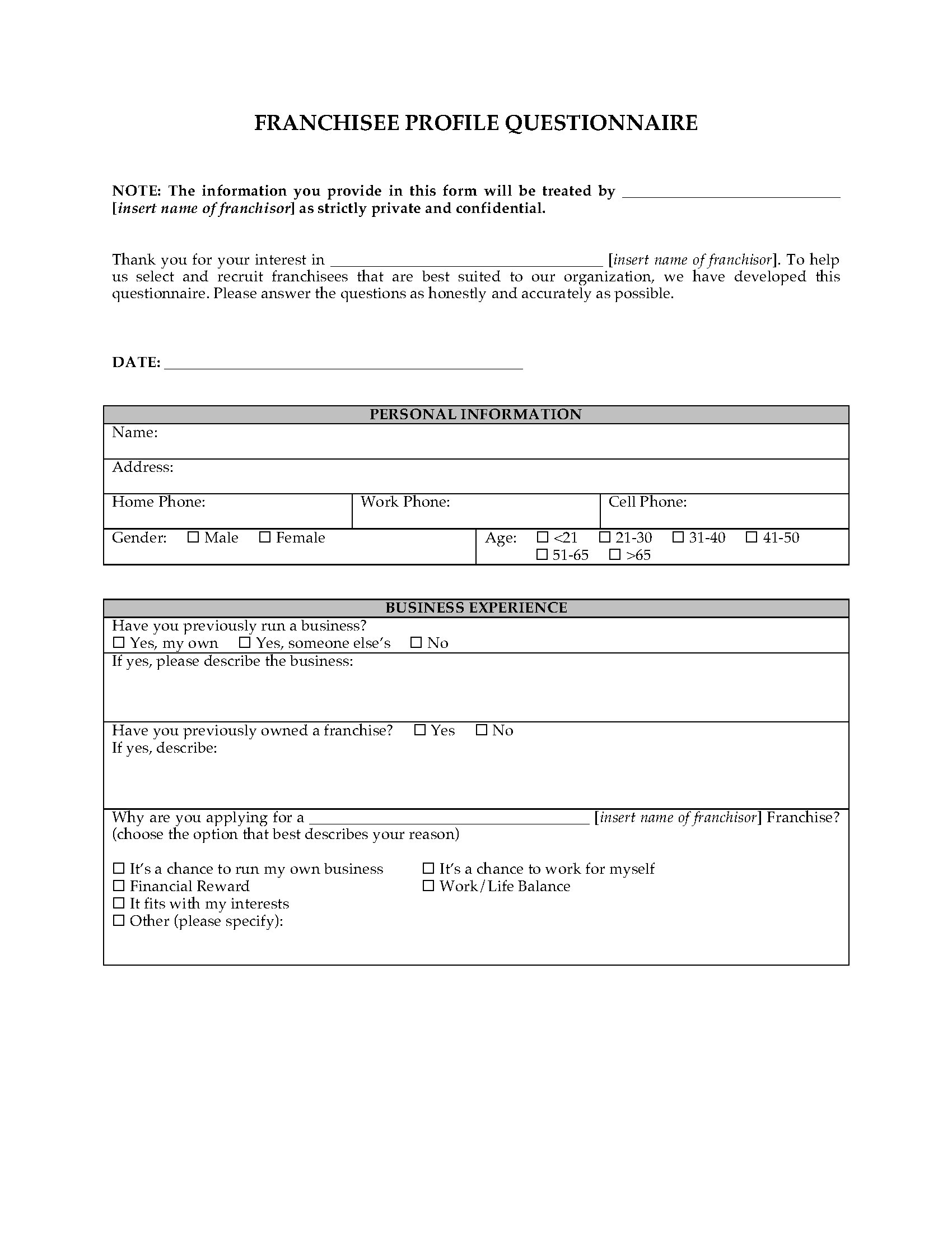 Screen your potential franchisees by having them complete this Confidential Evaluation and Application Form, for Canadian franchises.