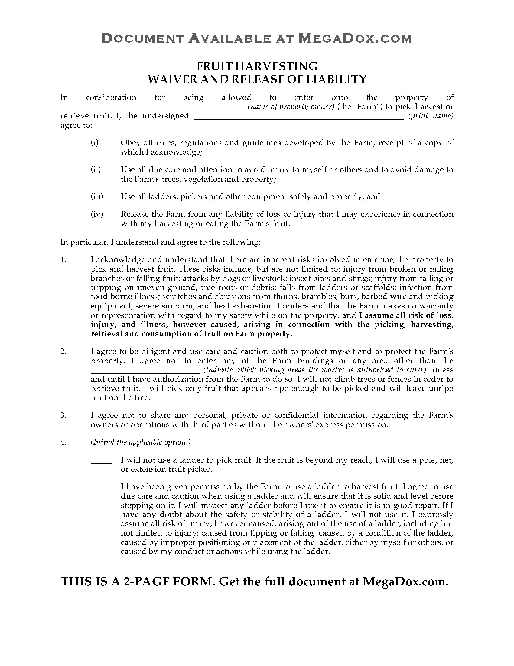 - The purpose of this legal form is to protect you and your business against lawsuits for injury, damages or death that occurred during or as a result of the volunteers' work experience on the farm.