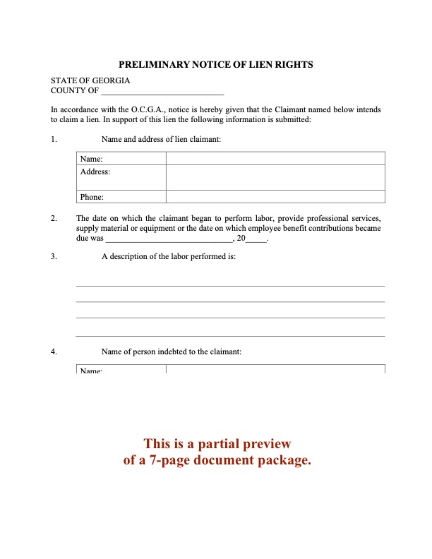 This form can be used by prime contractors, subcontractors, suppliers, mechanics, architects, engineers, foresters and surveyors who have provided labor, services, equipment or materials to a project in Georgia.