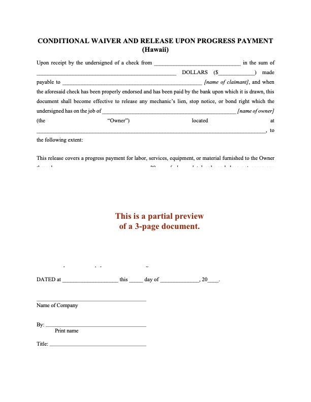 This Waiver and Release form is intended exclusively for use within the State of Hawaii. It should not be used in other states, as lien waiver and release laws can vary substantially between jurisdictions.