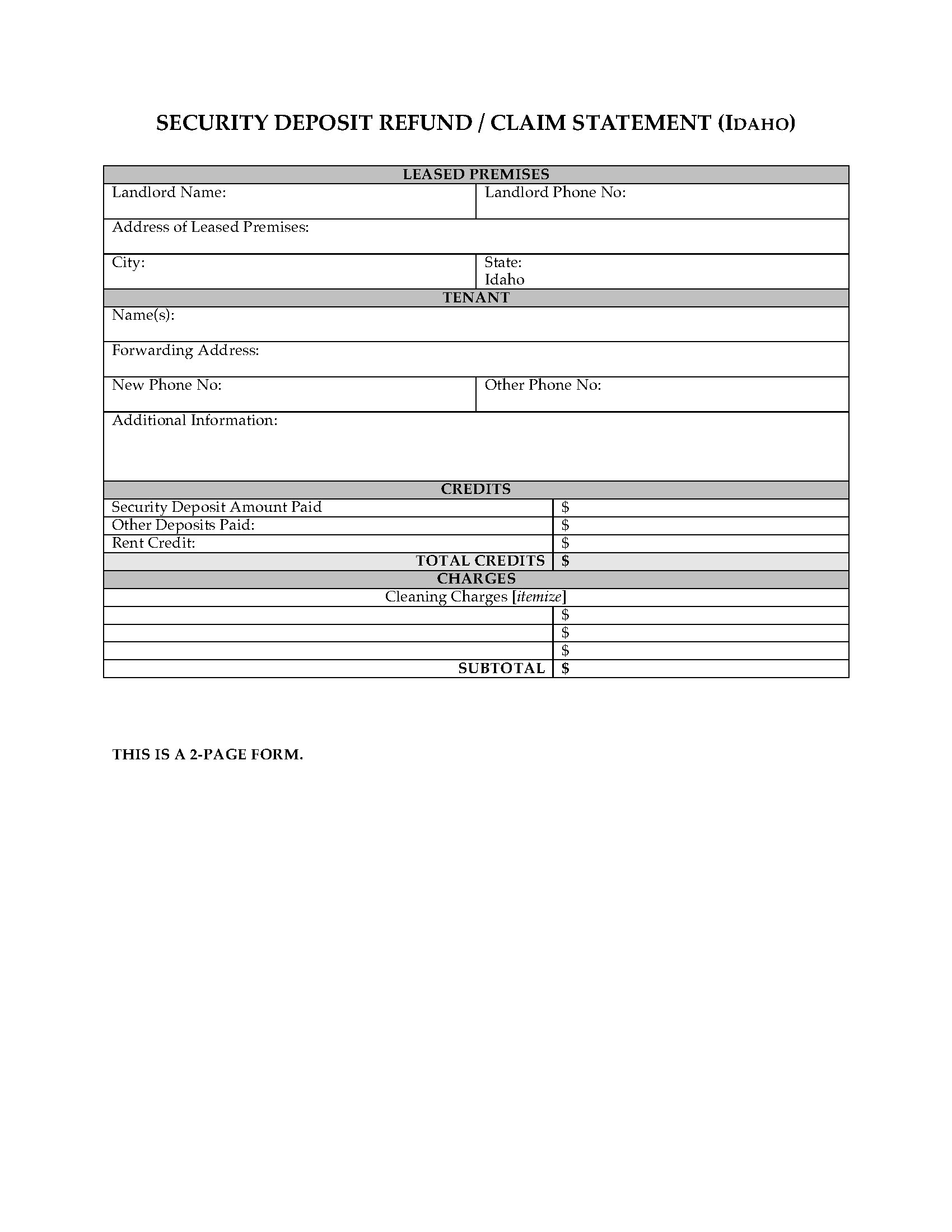 Idaho Security Deposit Refund â„ Claim Statement form is available as a MS Word download which can be filled in on the computer or by hand.
