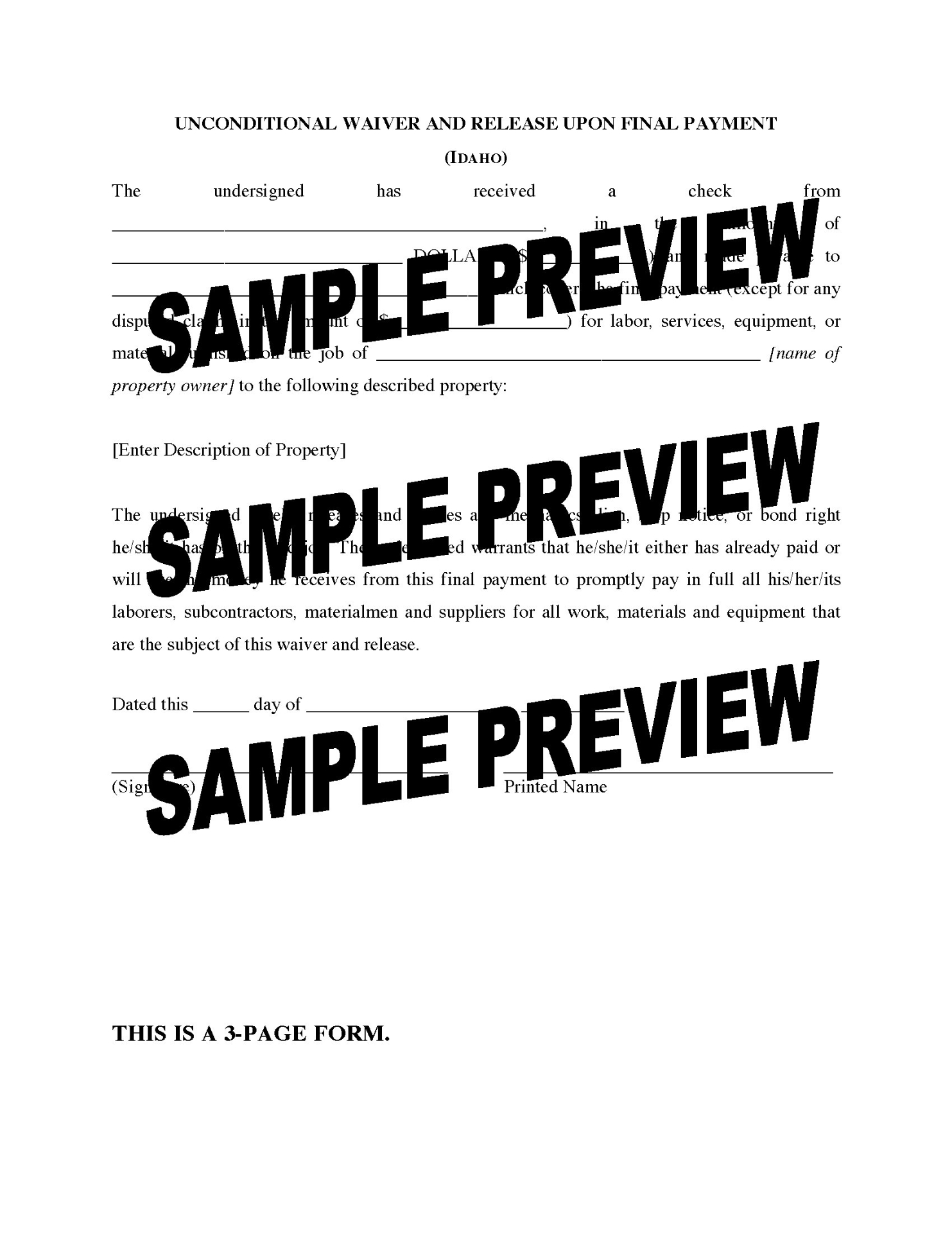 Please note that lien waiver and release laws can vary significantly between states. This Waiver and Release form is intended exclusively for use within the State of Idaho and may not be valid or suitable outside of the state.