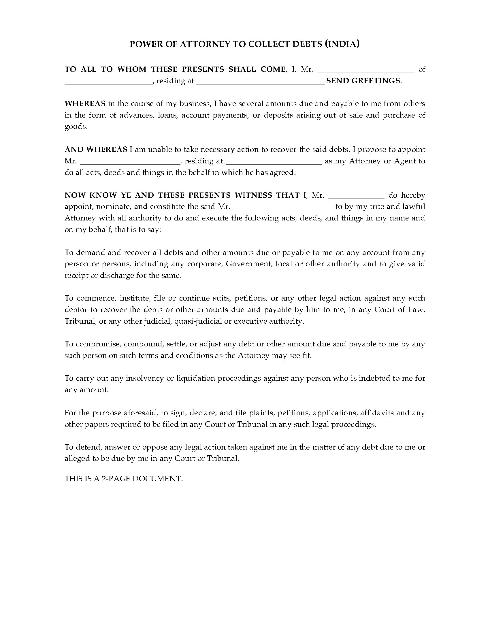 Appoint an attorney to collect and settle debts for you in India with this Power of Attorney to Collect Debts.