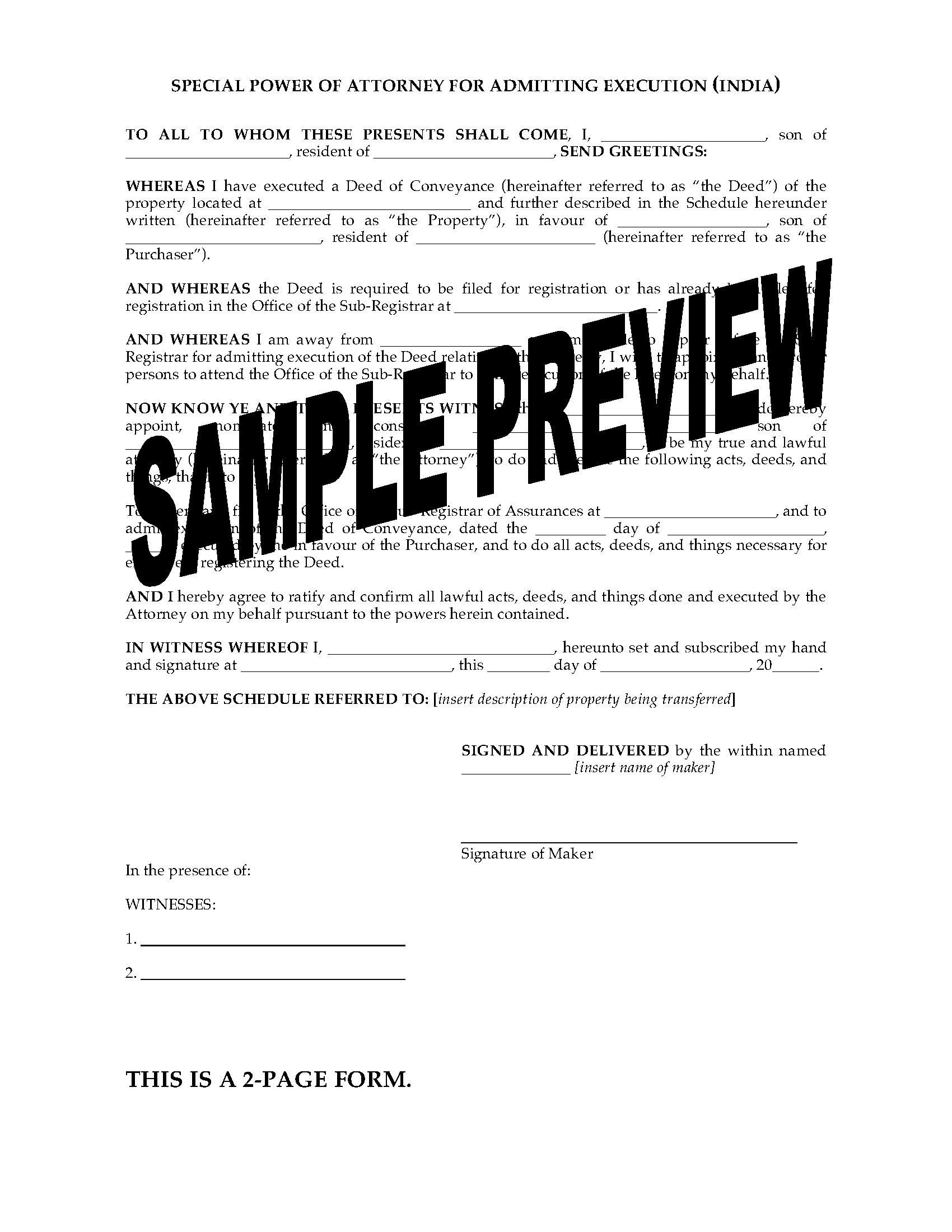 This Special Power of Attorney form gives your attorney the authority to admit execution of the Deed of Conveyance in the appropriate Sub-Registrar of Assurances Office.